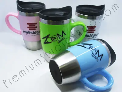 มาแรงมาก! แก้วเก็บความร้อนสกรีนโลโก้ แก้วเก็บความร้อนดีไซน์เก๋ๆ แก้วเก็บความร้อนทรงผอมมีหู Premium Studio จัดทำแก้วเก็บความร้อนพิมพ์โลโก้สุดน่ารัก แก้วเก็บความร้อนคละสี 6 สี ได้แก่ แก้วเก็บความร้อนสีแดง แก้วเก็บความร้อนสีเขียว แก้วเก็บความร้อนสีชมพู แก้วเก็บความร้อนสีฟ้า แก้วเก็บความร้อนสีส้ม และแก้วเก็บความร้อนสีมุก แก้วเก็บความร้อนสกรีนโลโก้ 2 สี แก้วเก็บความร้อนพิมพ์โลโก้ SGP โลโก้มีการประกบสีกันแต่ช่างพิมพ์ก็ไม่หวั่น พยายามสกรีนโลโก้ออกมาให้ประณีตสุดๆ แก้วเก็บความร้อนสกรีนโลโก้เพื่อโปรโมทบริษัท